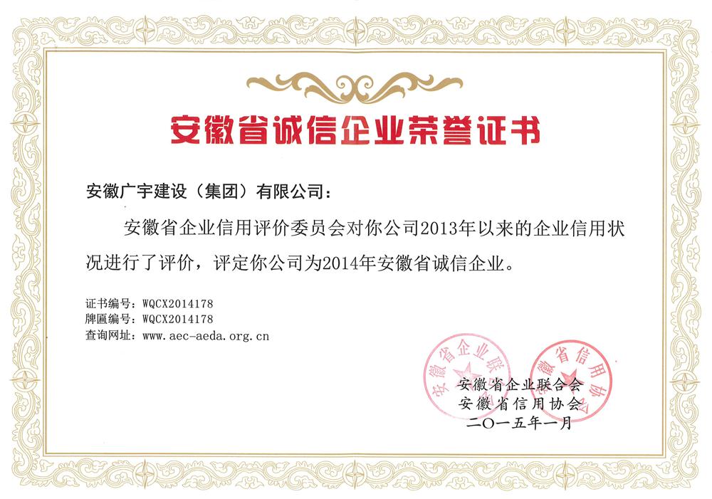 | 廣宇集團(tuán)被評(píng)為2014年安徽誠(chéng)信企業(yè) |