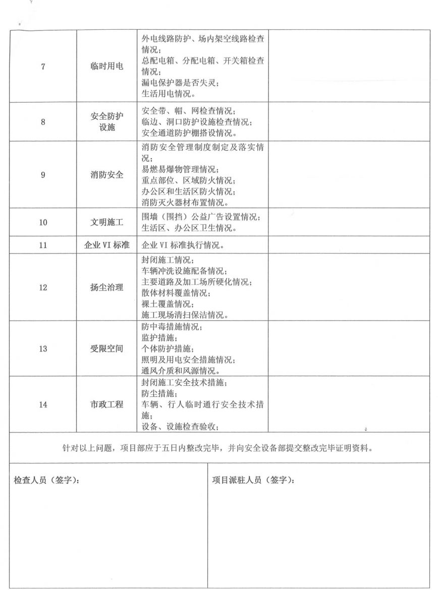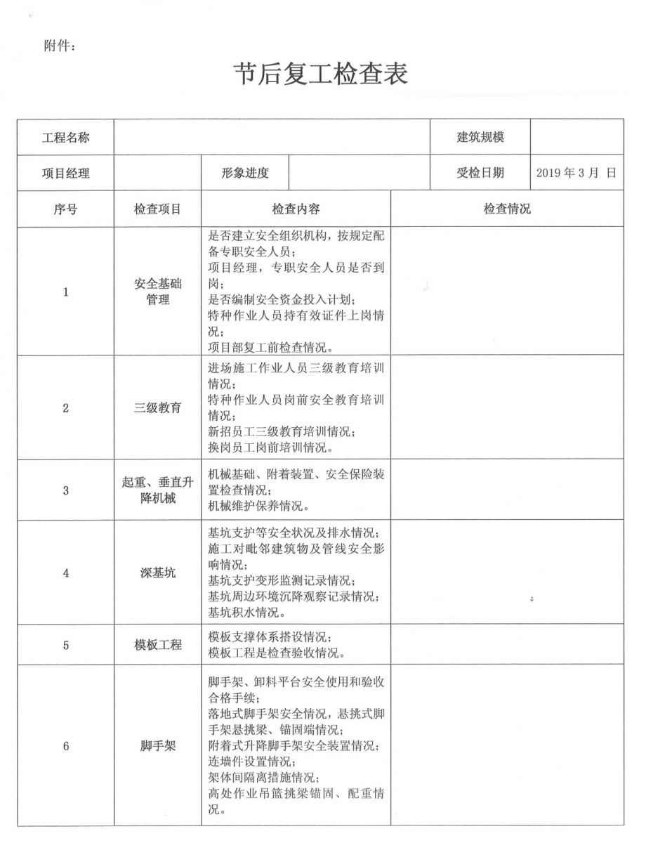 皖廣建字[2019]06號 集團公司各部室、子公司、項目部: 春節(jié)假期已經(jīng)結(jié)束,各項目已陸續(xù)進入復工階段。為進一步落實“四個意識”,提升“四種能力”建設(shè),鞏固增強施工現(xiàn)場安全、質(zhì)量及揚塵防治的管理工作,加快推進現(xiàn)場標準化進程,查隱患、排險情,確保當前安全生產(chǎn)形勢起步穩(wěn)定,為全年生產(chǎn)管理工作開好頭,公司決定對各在建項目開展節(jié)后復工暨春季施工安全、質(zhì)量及揚塵防治大檢查,現(xiàn)將有關(guān)事宜通知如下: 一、檢查時間 2019年3月1日——2019年3月12日 二、檢查組成員 組 長:張 濤 副組長:張亞偉 組 員:王 軍、藺 濤、方 路、李芬芬 三、檢查內(nèi)容 1、項目部復工工作 (1)項目部在接到通知后應(yīng)高度重視,通過開會議、抓培訓、搞宣傳等方式方法,廣泛深入開展節(jié)后復工動員部署工作,為生產(chǎn)活動的展開創(chuàng)造一個穩(wěn)定的環(huán)境。 (2)項目關(guān)鍵崗位人員必須全部到位履職,履行相關(guān)職責,并嚴格按照規(guī)定進行考勤。 (3)立即開展現(xiàn)場自查自糾工作,要杜絕盲目樂觀情緒和松懈麻痹思想,對自查過程中發(fā)現(xiàn)的問題要書面記錄并及時整改,整改情況書面記錄存檔備查。 (4)各項目在復工前應(yīng)對現(xiàn)場所有進場施工作業(yè)人員、新上崗人員、轉(zhuǎn)崗人員認真落實“三級”安全教育培訓,對其他返崗人員尤其是特種作業(yè)人員按規(guī)定進行崗前再教育、再培訓,務(wù)必使每位員工具備必要的安全生產(chǎn)知識,熟悉崗位安全生產(chǎn)操作規(guī)程,掌握安全生產(chǎn)基本技能; (5)開展復工前的安全教育培訓,要對作業(yè)人員進行登記造冊,未經(jīng)安全教育培訓的工人,不得上崗作業(yè)。復工前的安全教育培訓必須簽字齊全并記錄、留存。 2、安全生產(chǎn)、文明施工、揚塵防治檢查 (1)危險性較大的分部分項工程及深基坑、高支模、腳手架等超過一定規(guī)模的危險性較大的分部分項工程方案編制、審批及專家論證、方案的落實情況; (2)塔吊、施工升降機等施工機械備案情況,施工機械復工前檢查記錄,垂直運輸機械全過程安全監(jiān)控,施工機械設(shè)備檢查、保養(yǎng)、維修臺賬; (3)臨邊洞口、高處作業(yè)、臨時用電、模板支架、腳手架、地下室安全設(shè)施、消防裝置是否按相關(guān)規(guī)定布置落實,防高墜專項方案的編制、審批和落實情況; (4)按照建設(shè)行政主管部門的文件要求,落實各項揚塵防治措施的情況; (5)企業(yè)VI標準的執(zhí)行及崗位責任制的落實情況; (6)作業(yè)人員安全技術(shù)交底、特種作業(yè)人員執(zhí)證上崗及崗前教育情況,安全資料的同步收集整理及存檔情況。 (7)安全標準化工地的創(chuàng)建情況。 3、質(zhì)量管理 (1)施工現(xiàn)場工程質(zhì)量管理體系、管理制度的落實情況; (2)強制性標準執(zhí)行情況; (3)質(zhì)量標準化建設(shè)執(zhí)行情況; (4)現(xiàn)場原材料取樣檢測及工程資料收集整理情況。 (5)質(zhì)量精品工程的創(chuàng)建情況。 各項目部接到通知后必須統(tǒng)一思想、提高認識、落實責任,按各級建設(shè)行政主管部門及集團公司的要求做好各項復工前準備工作,認真落實安全生產(chǎn)、質(zhì)量管理、揚塵防治工作。公司將嚴格按照文件要求對在建項目進行全面檢查,對現(xiàn)場自查不力、查而不糾、被動應(yīng)付的項目,公司按《項目安全生產(chǎn)責任書》嚴厲處罰。 二〇一九年二月二十日 附:節(jié)后復工檢查表